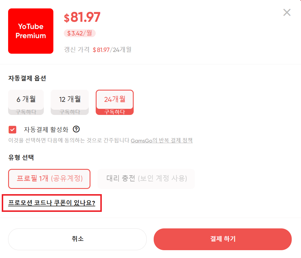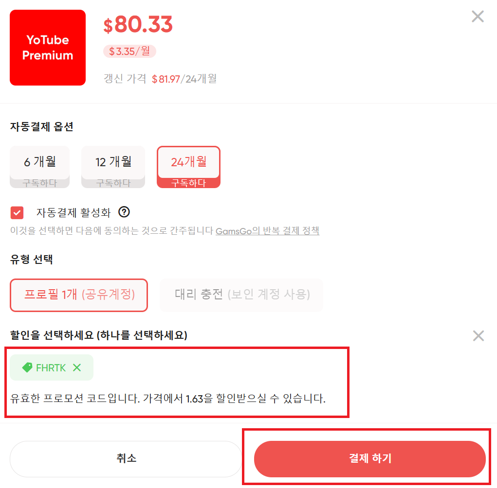 3️⃣ '유튜브 프리미엄' 카테고리에서 원하는 개월수를 선택하여 프로모션 코드를 입력합니다. (프로모션 코드 : FHRTK)