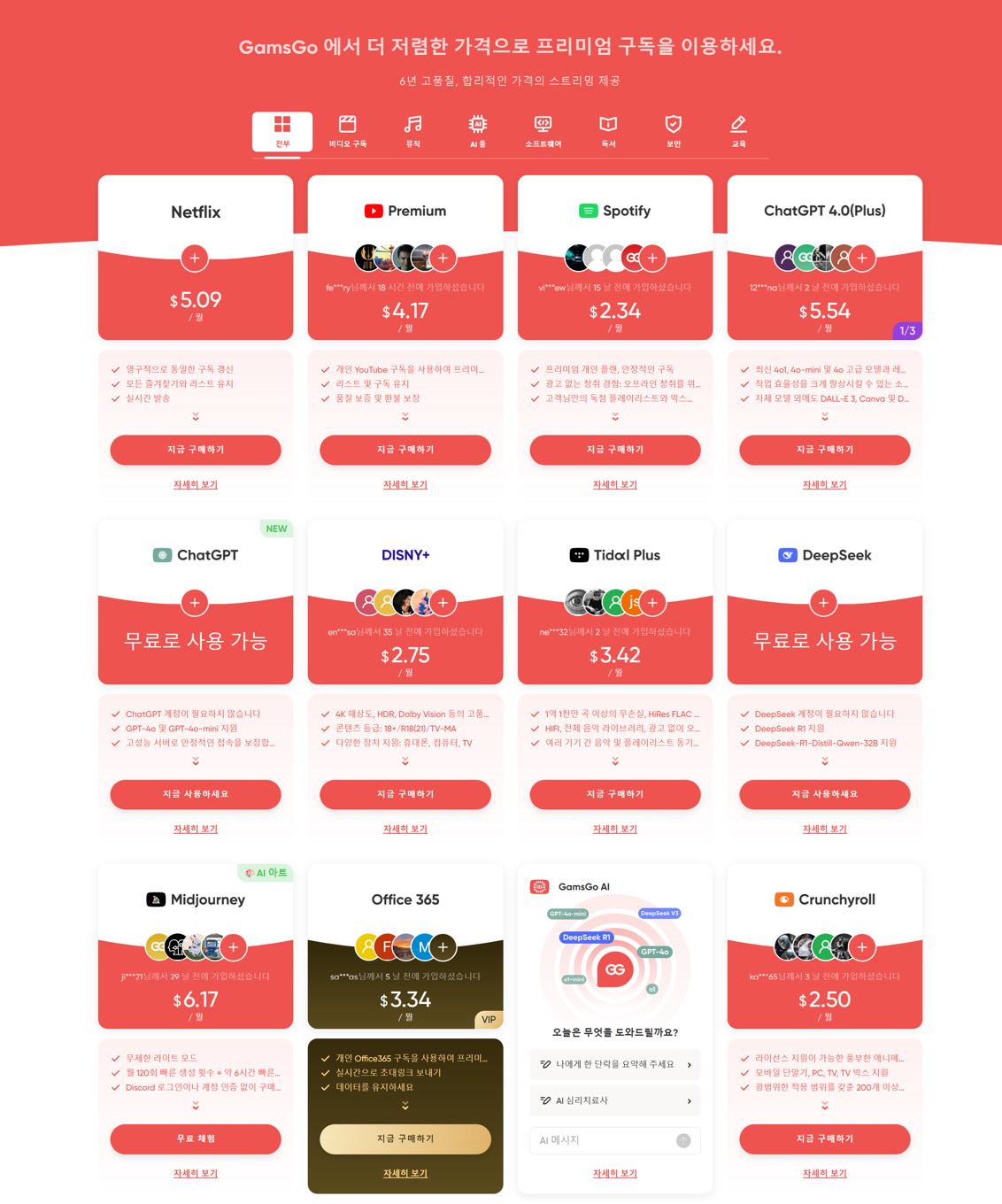 📍겜스고는 고객들이 다양한 OTT 서비스에 합리적인 가격으로 지원해주는 플랫폼입니다. 여러 스트리밍 서비스를 함께 공유를 하며 사용자들의 생활을 보다 편리하게 만들어줍니다.