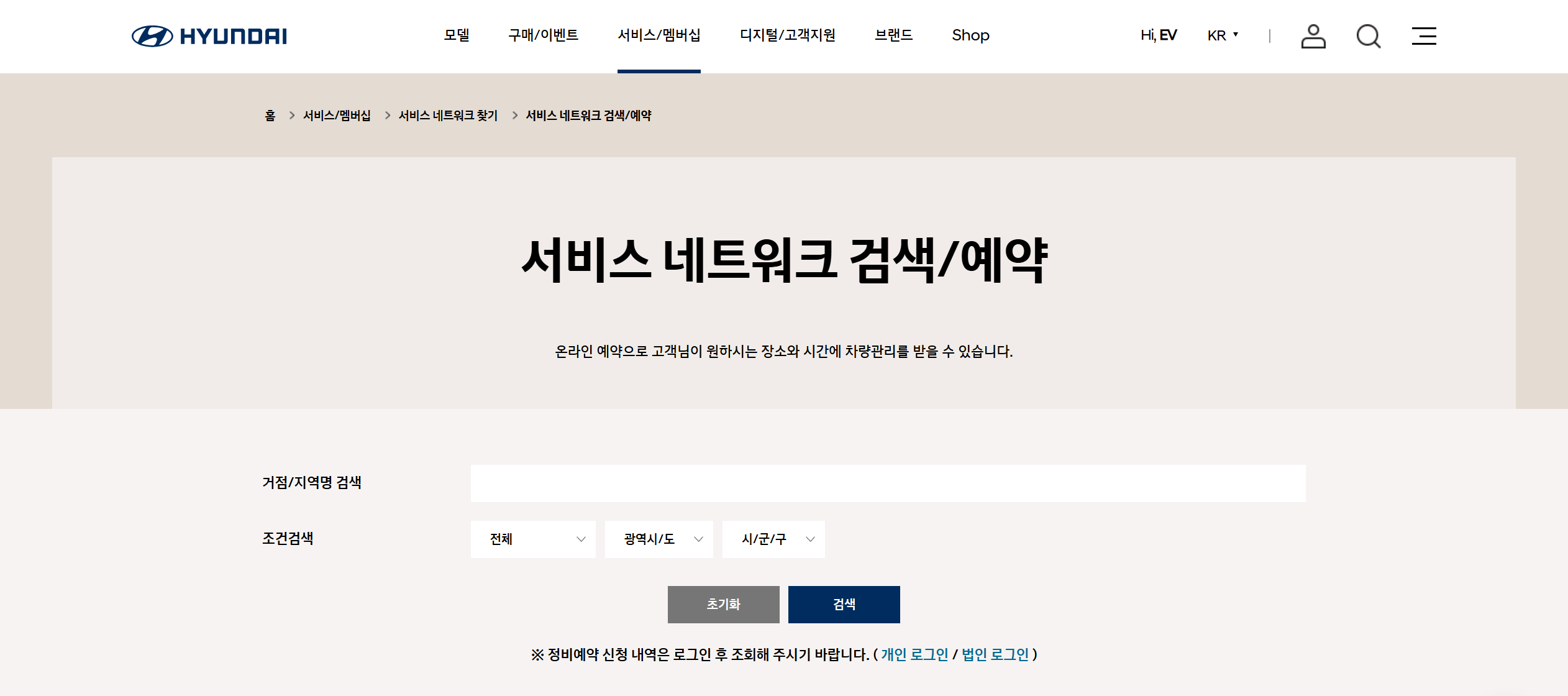 2️⃣ 서비스 네트워크 검색 및 예약 페이지 이동 후 상단 메뉴에 '서비스/멤버십'을 선택 후 '서비스 네트워크 찾기'를 클릭합니다.