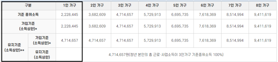 ** 유지기준 : 청년층의 근로 및 사업소득 합계가 중위소득의 100% 미만인 경우